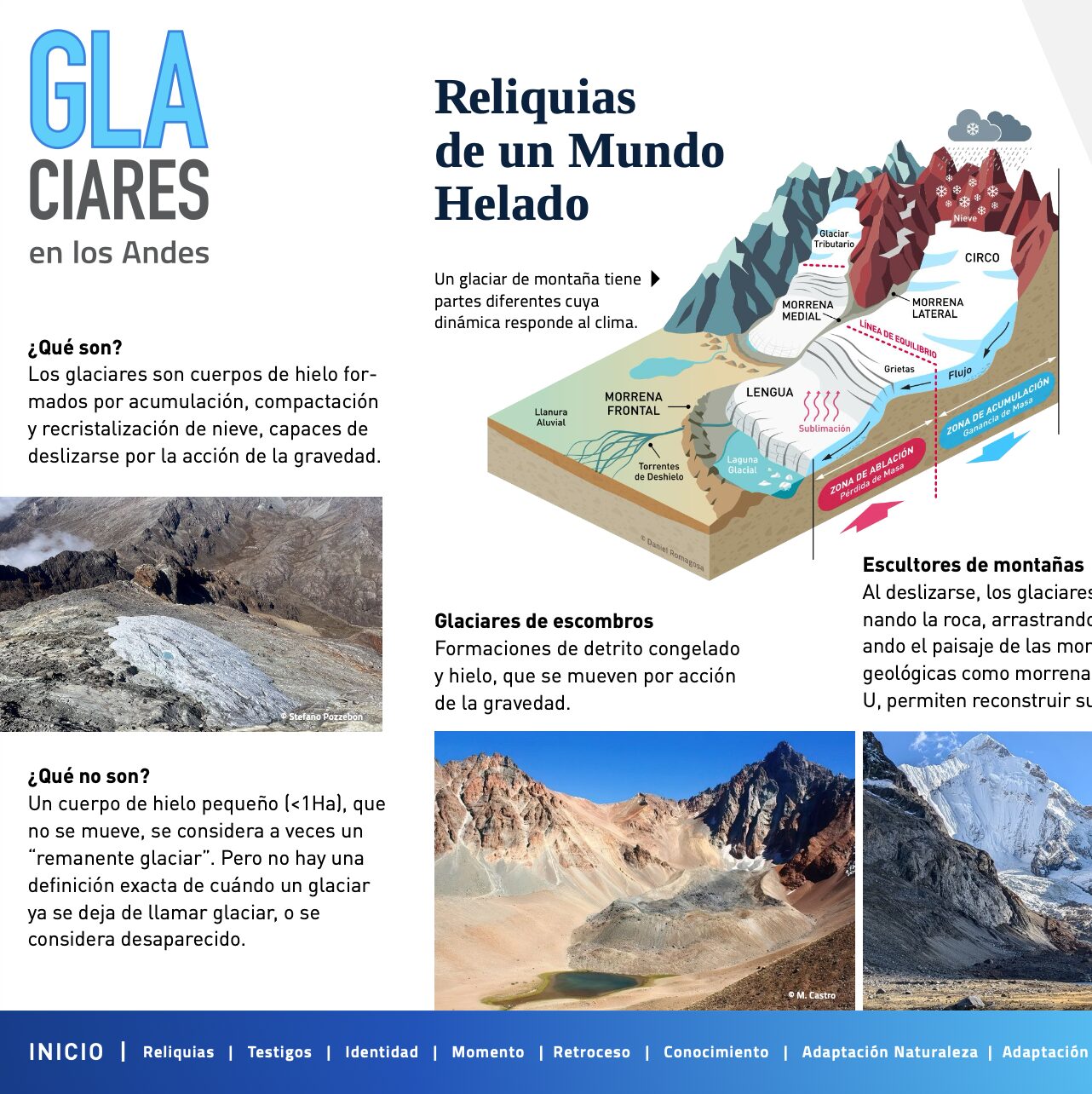 The infographic addresses various critical aspects, from glacier formation and their current precarious situation to the fundamental role they play in the Andean region: